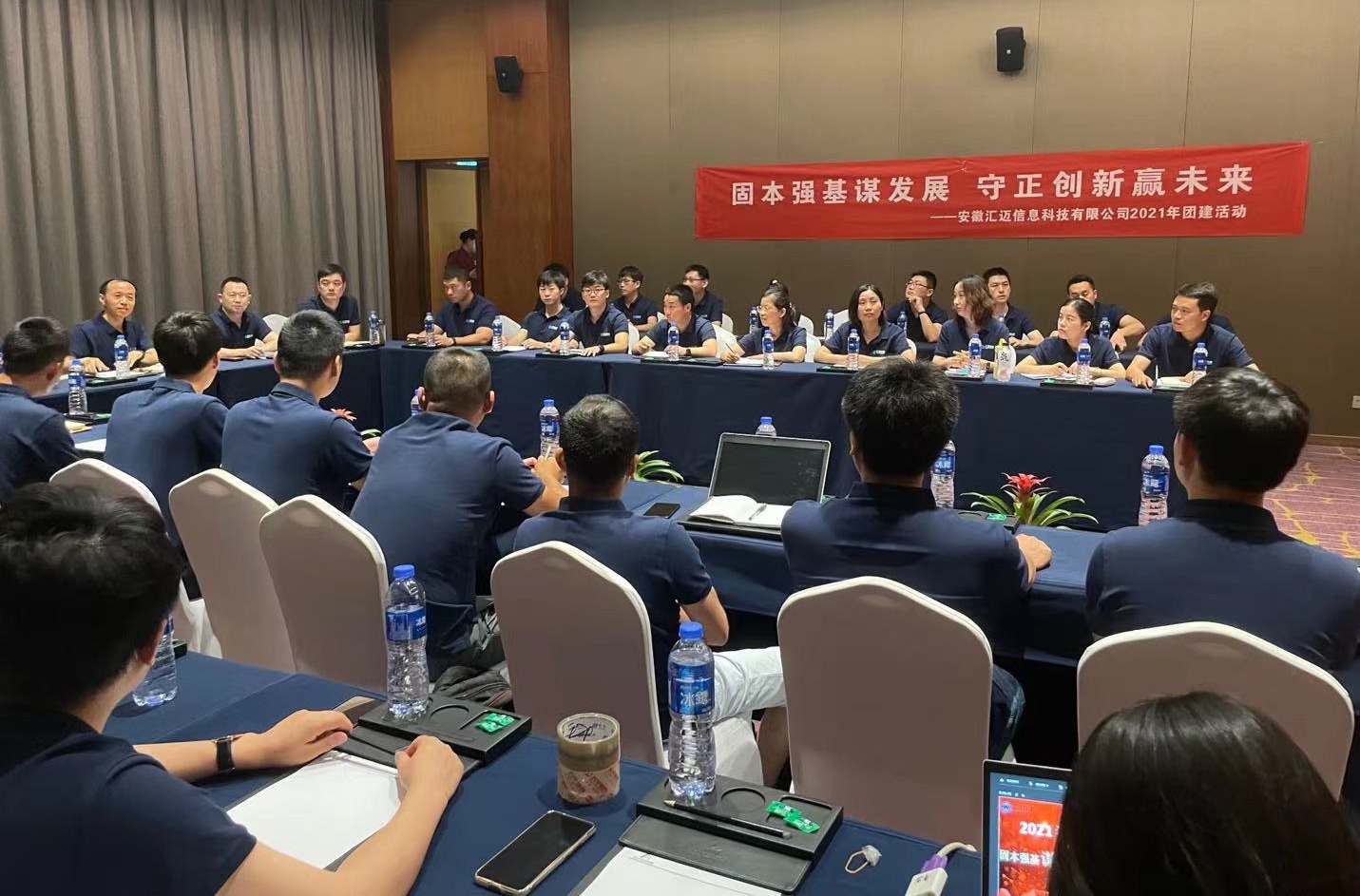 7月3日,汇迈科技2021年上半年度工作会议在美丽的黄山太平湖景区酒店顺利召开,公司全体员工参会。会议围绕“固本强基谋发展,守正创新赢未来”主题进行。首先,总经理王希锐对上半年取得的成绩及所有员工的付出给予了充分的肯定和表彰,整体经营形势向好,关键经营指标同比显著增长,自主知识产权的核心重点产品盈利能力持续提升。同时,王总特别指出要时刻怀有危机意识,全面分析存在的主要问题,研判下半年发展态势,并对下半年度的工作进行了系统部署。公司副总、各部门正职、所属单位负责人等对半年度工作做了汇报。