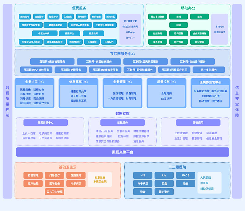 县域医共体一体化平台以“云化部署、平台化应用、智能化业务、精细化管理”为建设导向,从业务协同、信息共享、业务管理、质量控制、医共体监管、互联网服务、便民服务、绩效考核、基层卫生云服务、数据支撑、互联互通等十一个方面完善医共体业务系统,构建区域一体、上下联动、信息互通的区域医疗卫生服务体系。